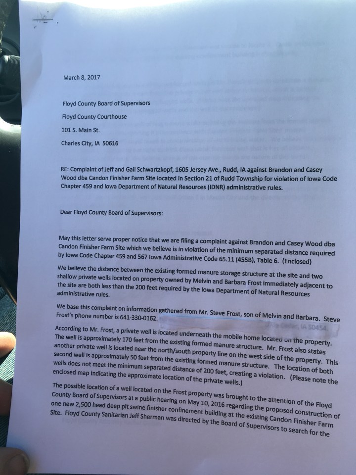 “We believe the distance between the existing formed manure storage structure at the site and the two shallow private wells located on the property owned by Melvin and Barbara Frost immediately adjacent to the site are both less than the 200 feet required by the Iowa Department of Natural Resources administrative rules,” the Schwartkopfs wrote in a letter to the Floyd County Board.