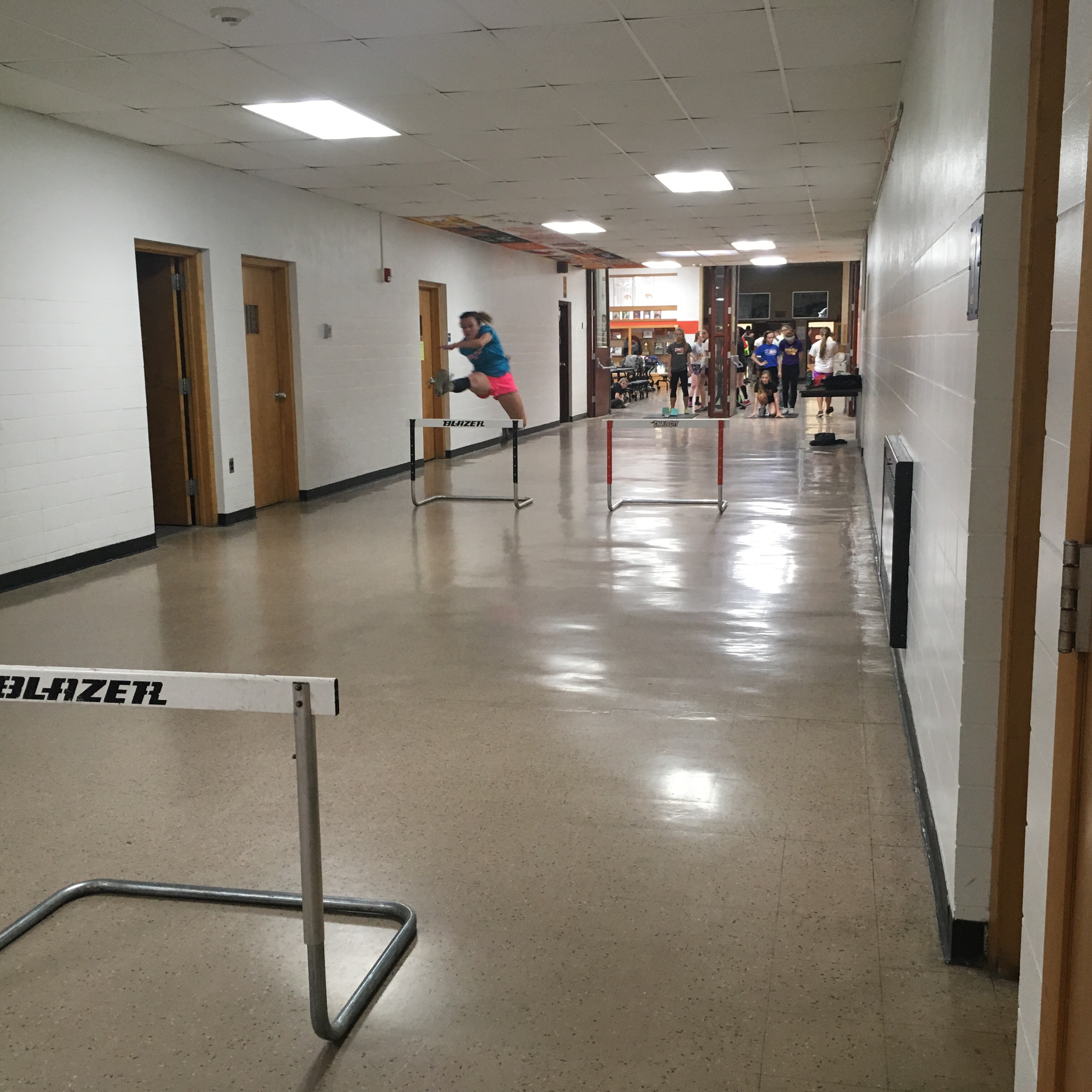 The Charles City High School girls and their coach, Darren Bohlen, improvised by setting up up hurdles in the hallway outside the principal’s office. Without the markings that are on the Comet Stadium track, they used a tape measure to get the right distance between hurdles.