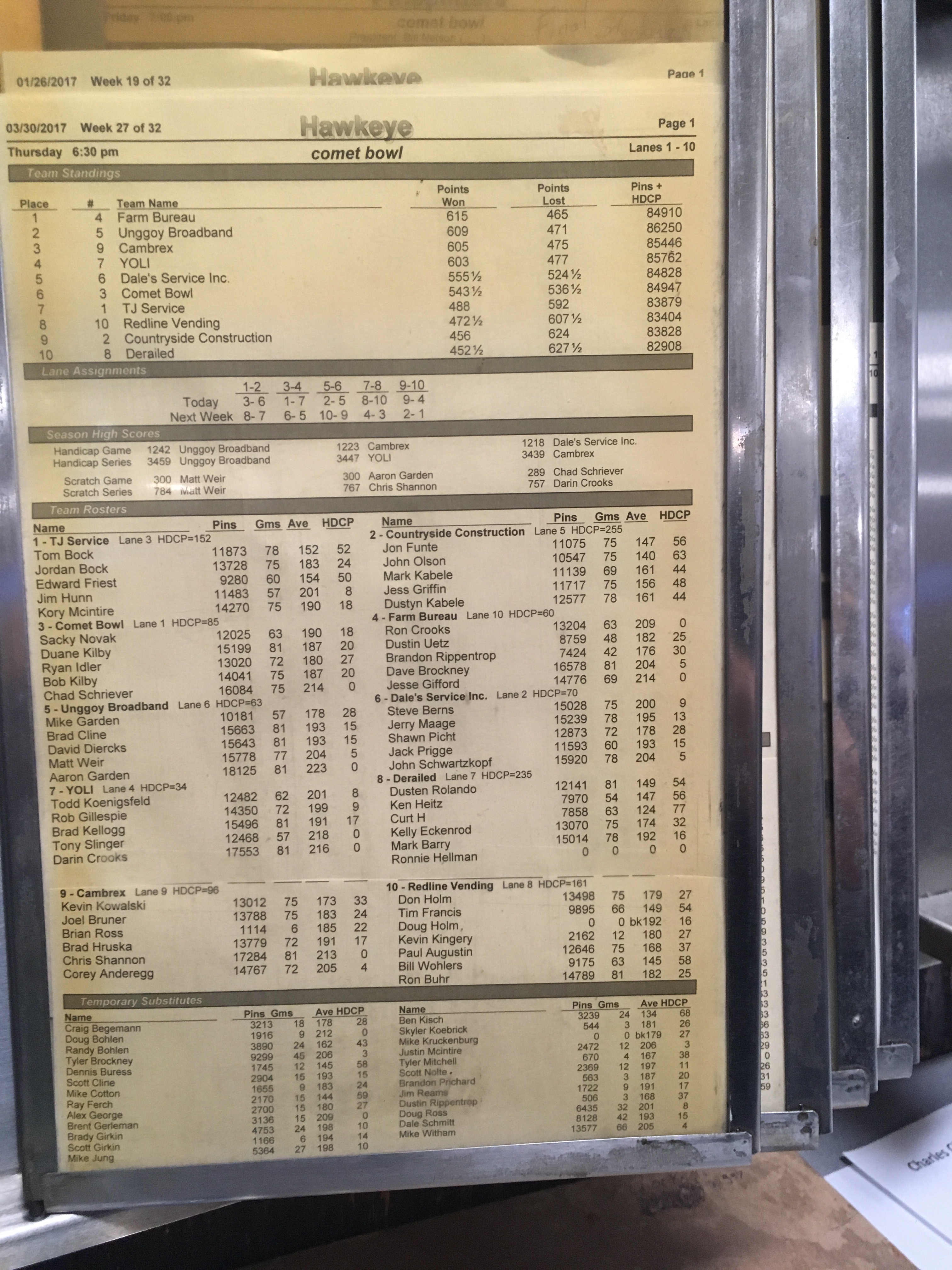 CHARLES CITY — Team DFS ran wrapped up the Pinsplitters League season in first place. They notched 70 points won to 26 lost. The second place team, Colwell Tap, had 55 1/2 points won.