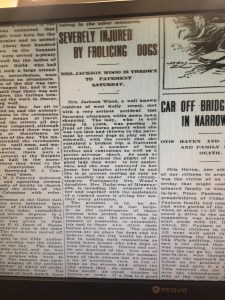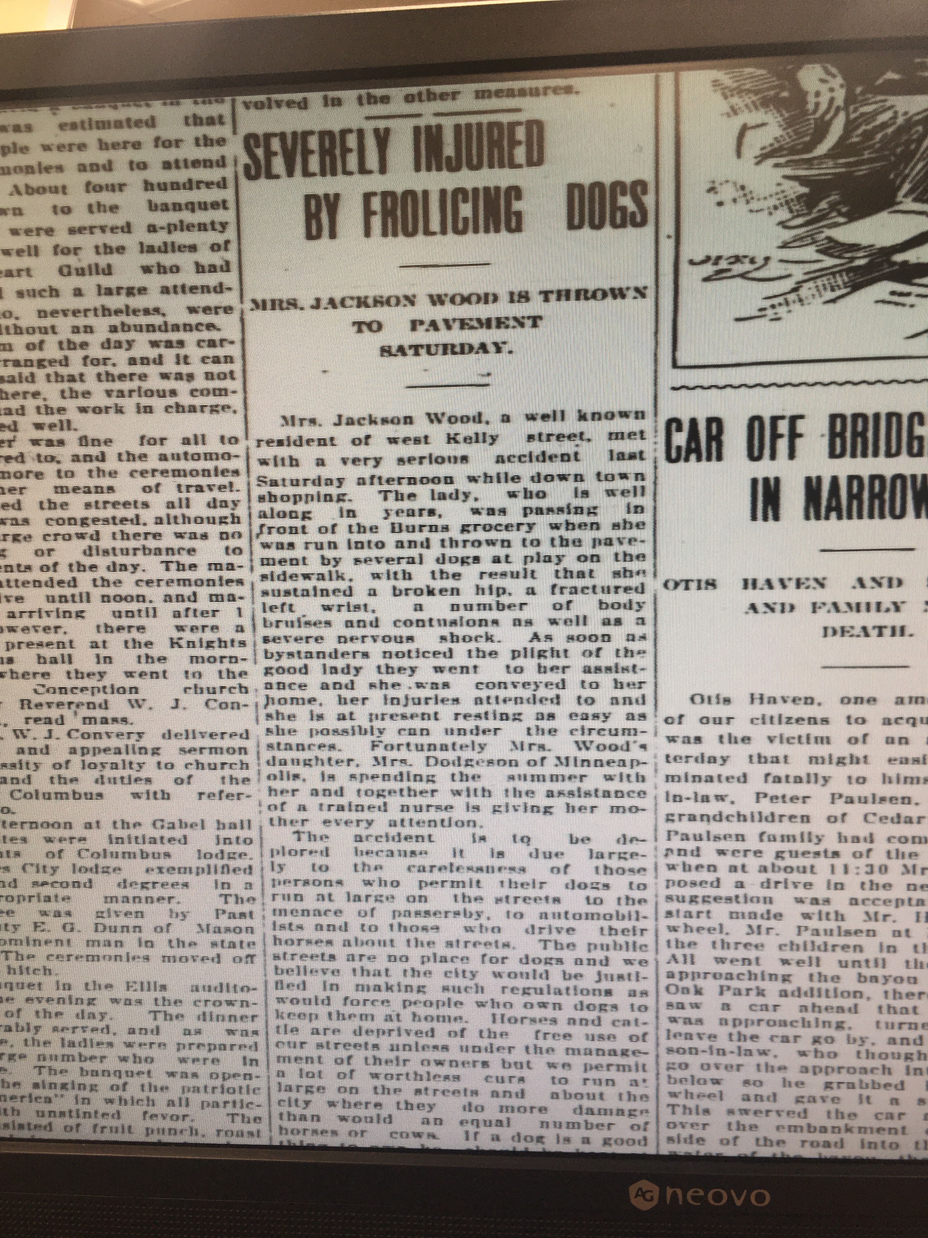 Mrs. Jackson Wood, a well-known resident of west Kelly Street, met with a very serious accident last Saturday afternoon while downtown shopping. The lady, who is well-along in years, was passing in front of the Burns grocery when she was run into and thrown to the pavement by several dogs at play on the sidewalk, with the result that she sustained a broken hip, a fractured left wrist, a number of body bruises and contusions as well as a severe nervous shock.