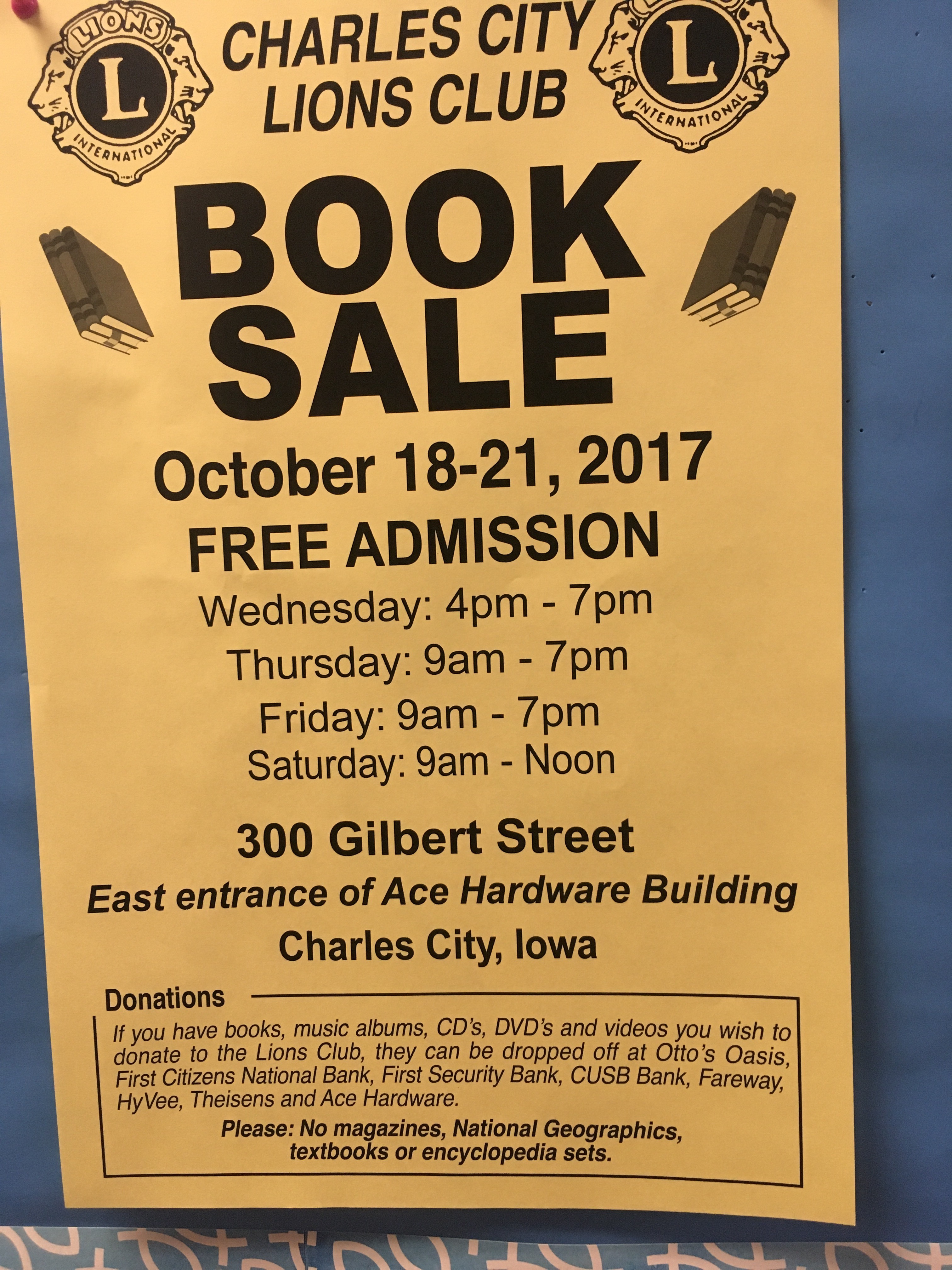 Calendar, Charles City CC Lions Book Sale is Oct. 18-21 Share this: Click to share on X (Opens in new window) X Click to share on Facebook (Opens in new window) Facebook Like Loading...