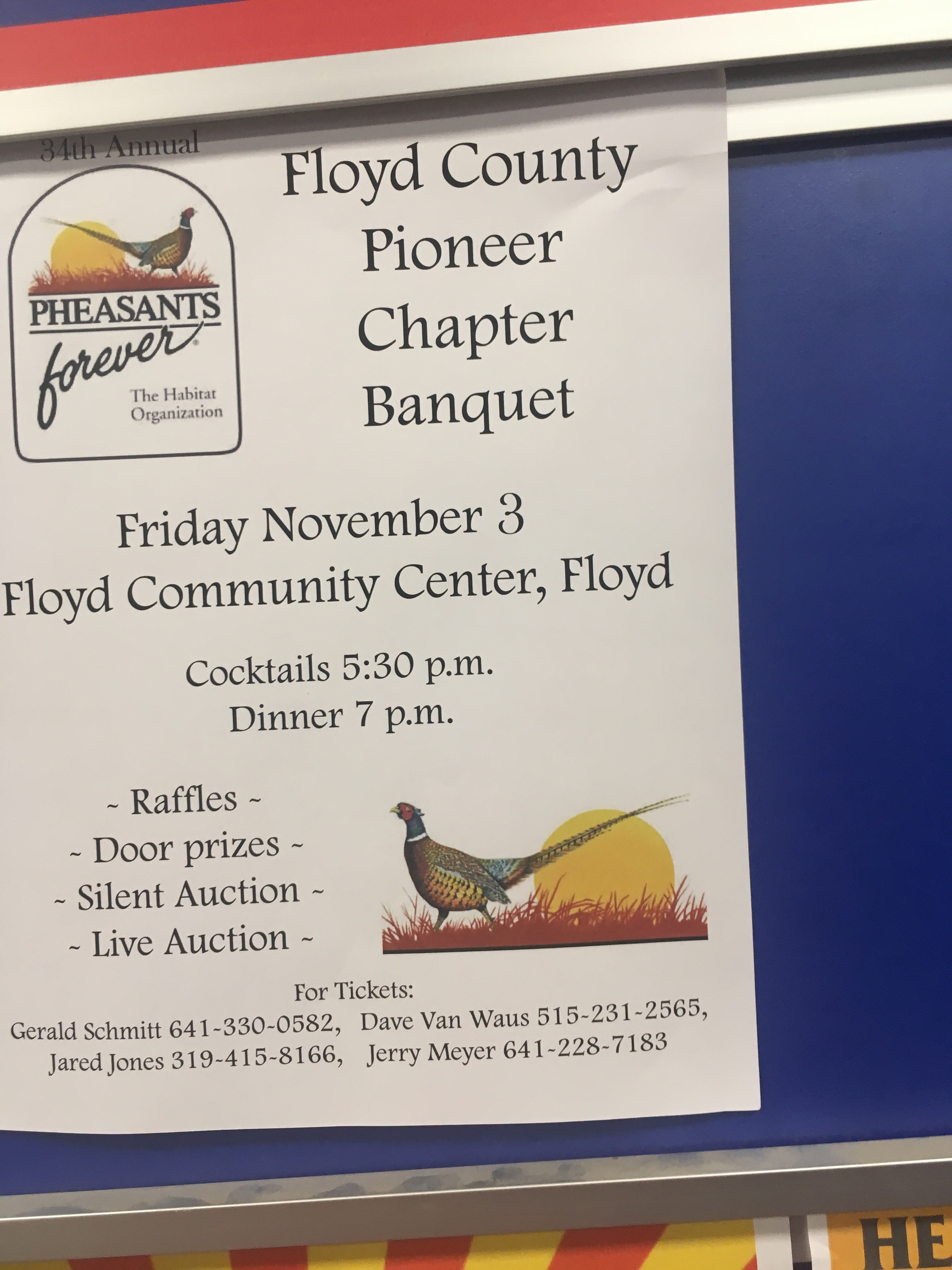 The Floyd county pioneer chapter banquet of pheasants forever will feature a salad auction live auction door prizes and raffle’s. Cocktails begin at 5:30 p.m. with the dinner at 7 p.m. Friday, Nov. 3, in the Floyd Community Center in Floyd.