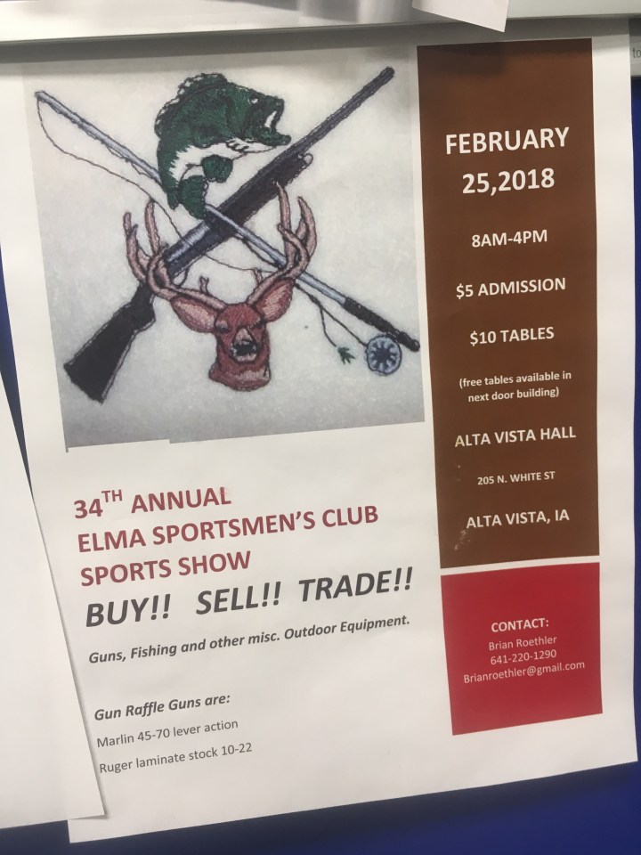 The 34th annual Elma Sportsmen’s Club Sports Show is 8 a.m. to 4 p.m. Sunday, Feb. 25, at the Alta Vista Hall. Admission is $5.