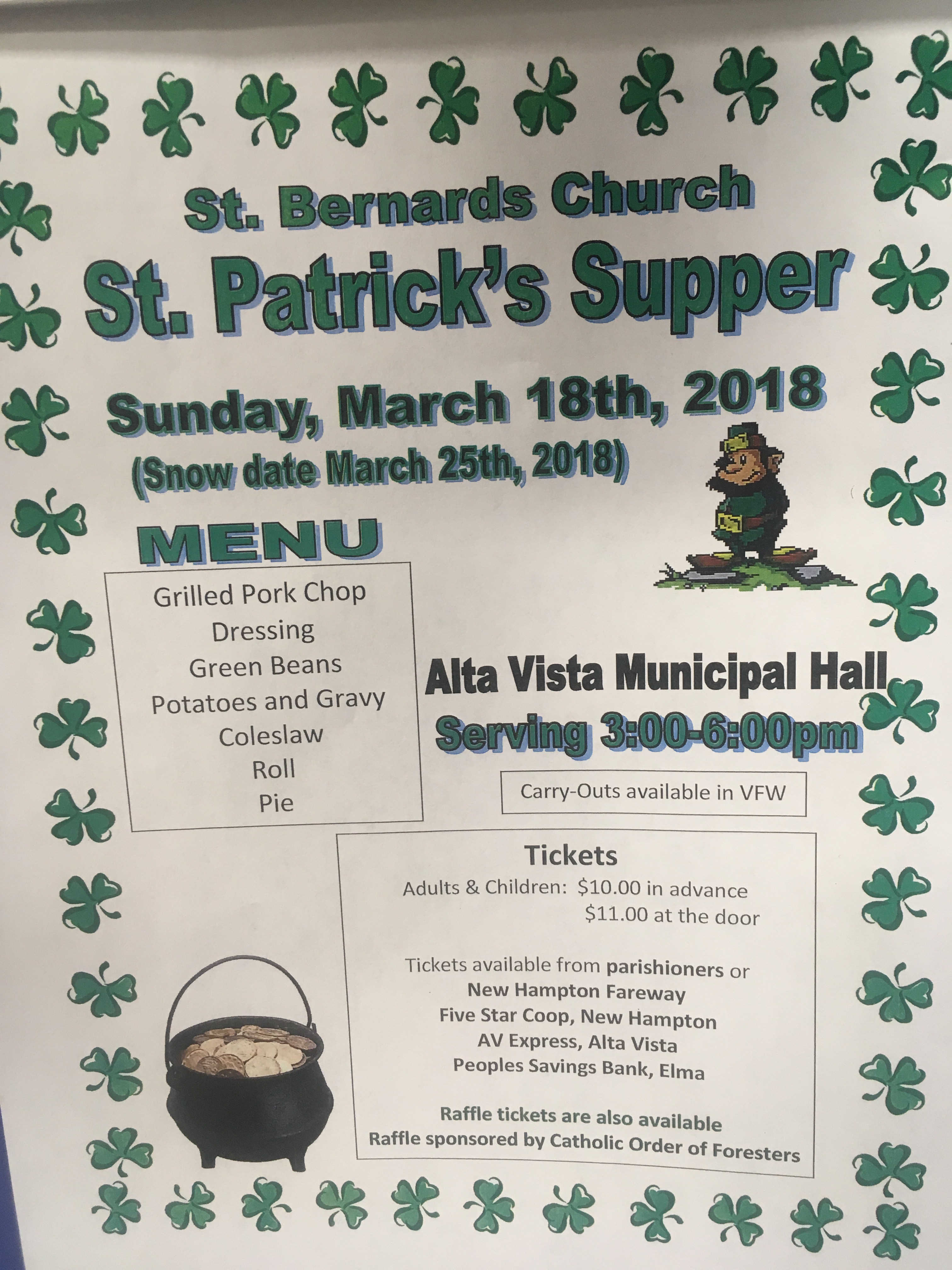 ALTA VISTA — St. Bernard’s Church will host its St. Patrick’s Supper from 3-6 p.m. Sunday, March 18, in the Alta Vista Municipal Hall. The menu includes grilled pork chops, dressing, green beans, potatoes and gravy, cole slaw, rolls and pie.