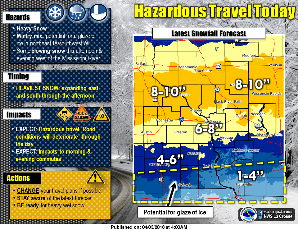 The National Weather Service issued hazardous travel and weather warnings on Monday. Heavy snow and light freezing drizzle are expected between 1 a.m. Tuesday and 4 a.m Wednesday. Snow accumulations of 4 to 6 inches, with localized amounts up to 8 inches, and ice accumulations of a light glaze are expected along and north of a line from Charles City to Decorah.