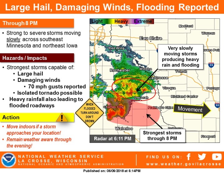 National Weather Service forecast for Saturday, June 9: Strong to severe storms continue to move through northeast Iowa and southeast Minnesota. The strongest storms (mainly in northeast Iowa) have produced large hail up to the size of golf balls and wind damage, with 70+ mph gusts reported. In addition, heavy rain is falling across much of the area, leading to many roads being underwater. If traveling this evening, be alert for water over roadways, and NEVER drive through floodwaters.