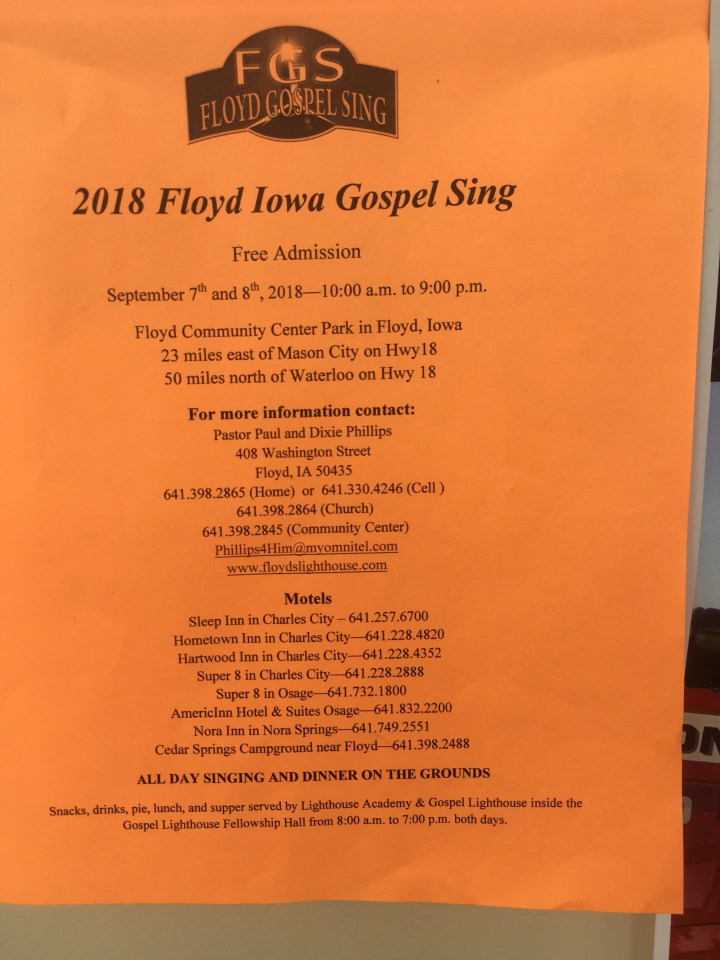 Floyd County 2018 Floyd Gospel Sing is Sept. 7-8 Share this: Click to share on X (Opens in new window) X Click to share on Facebook (Opens in new window) Facebook Like Loading...