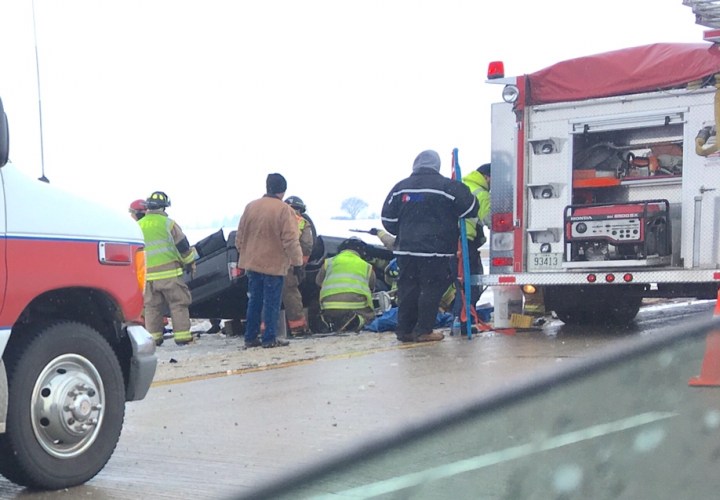 RUDD — Emergency responders are on the scene of a single-vehicle crash on the Avenue of the Saints near Rudd. A vehicle is upside down in the median and responders appear to be trying to extricate someone.