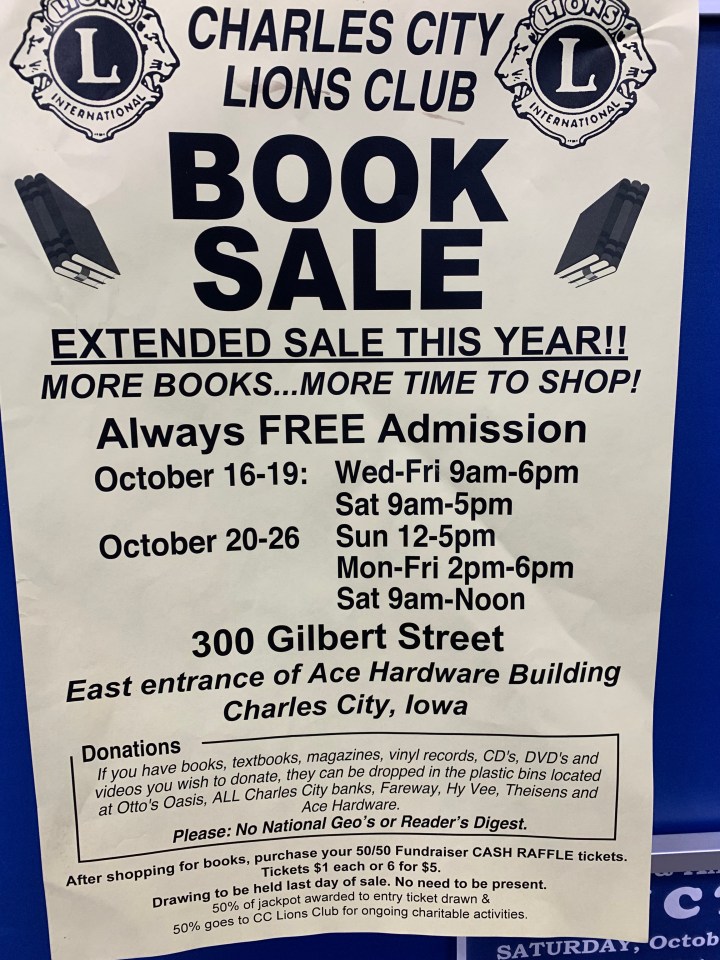 CHARLES CITY — The Lions Club has added hours to its annual Book Sale, which will offer up to 50,000 books.