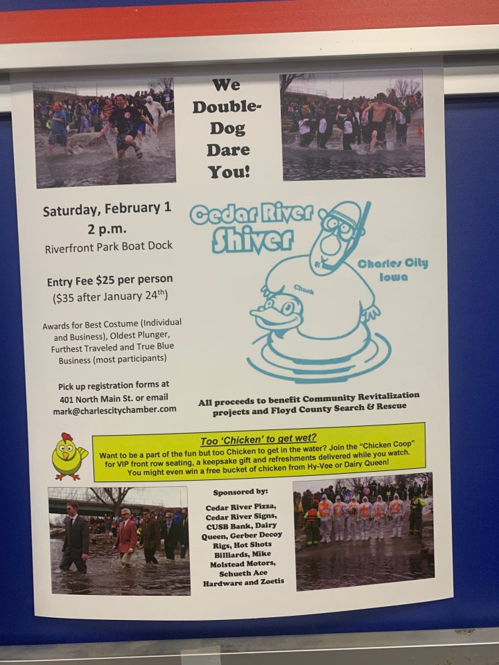 Charles City Cedar River Shiver is Feb. 1 in Charles City Share this: Click to share on X (Opens in new window) X Click to share on Facebook (Opens in new window) Facebook Like Loading...