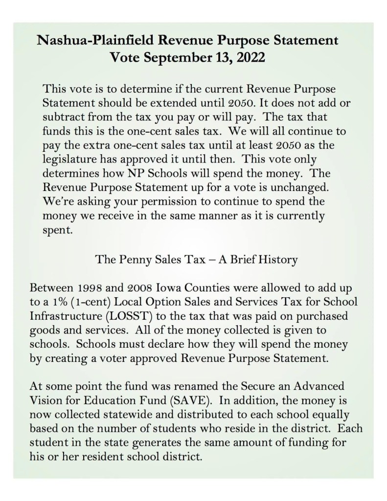 4. SCHOOL VOTE: Voters approved Nashua-Plainfield’s revenue purpose statement on Tuesday. The unofficial results are Bremer County 52-10, Chickasaw 67-3, and Floyd County 5-0.
