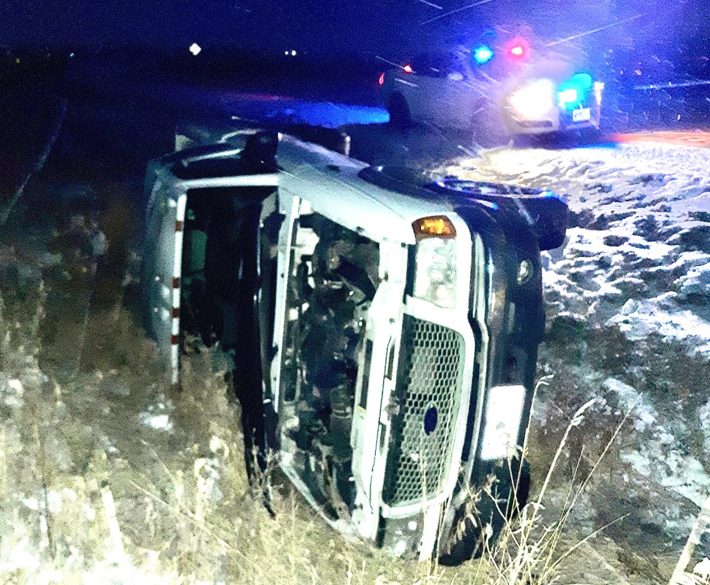 On Friday, Nov. 18, just before 6 a.m., a white Ford Ranger was traveling west on Golden Road when due to weather conditions the vehicle lost control, crossed the center line, rolled over into the ditch and came to rest on its side. No injuries were reported and vehicle was towed from the scene. Snow was falling at the time of the crash. The accident remains under investigation.
