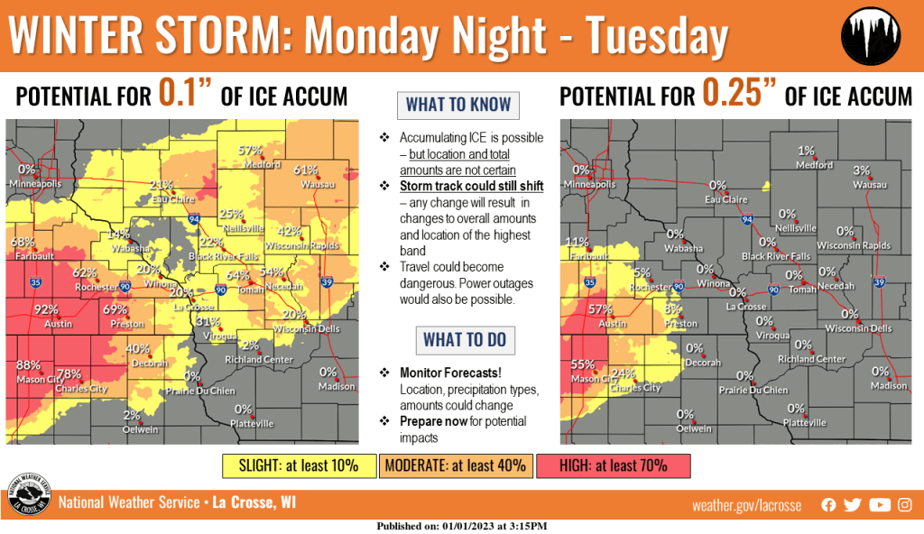 Monday night will see more rain, possibly freezing rain, with the low temperature around 33 and an east wind 11 to 16 mph, with gusts as high as 30 mph. Ice accumulation of 0.1 to 0.3 of an inch possible.