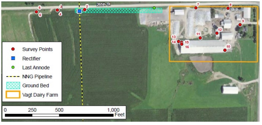 Northern Natural Gas says the stray voltage claims made by the Vagts are based on unsupported theories and its testing detected no safety problems caused by the cathodic protection system mitigating corrosion of the pipeline. The system is required by federal law, it notes.