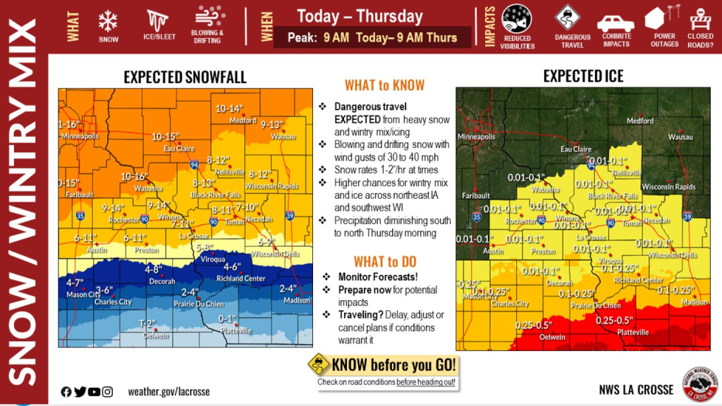 Today: Snow, freezing rain, and sleet before 4 p.m., then snow and sleet. High near 28. Blustery, with a northeast wind 17 to 24 mph, with gusts as high as 40 mph. Total daytime ice accumulation of less than a 0.1 of an inch possible. Total daytime snow and sleet accumulation of 1 to 3 inches possible.
