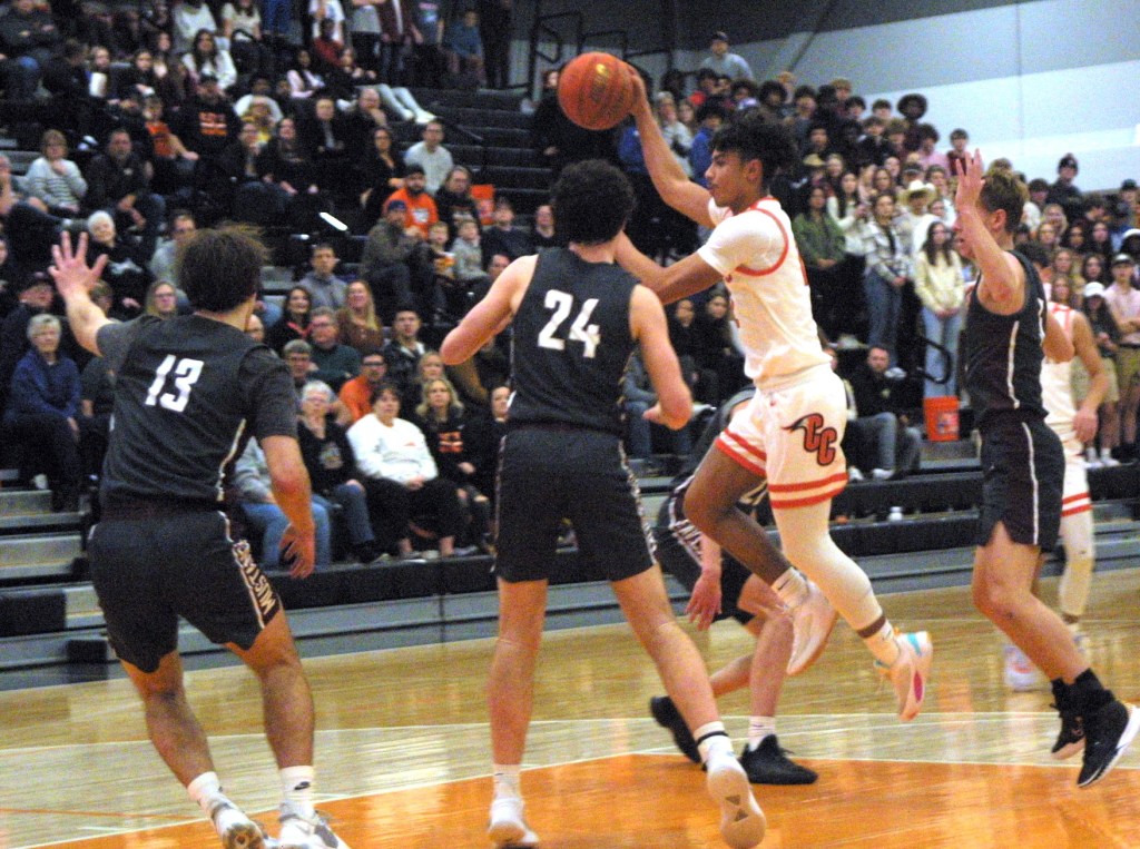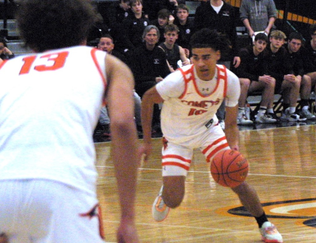 Enter Comet Brennan Schmidt lunging from behind and knocking the ball loose to teammate Chase Low. He fires it ahead for a Kam Mestas dunk.