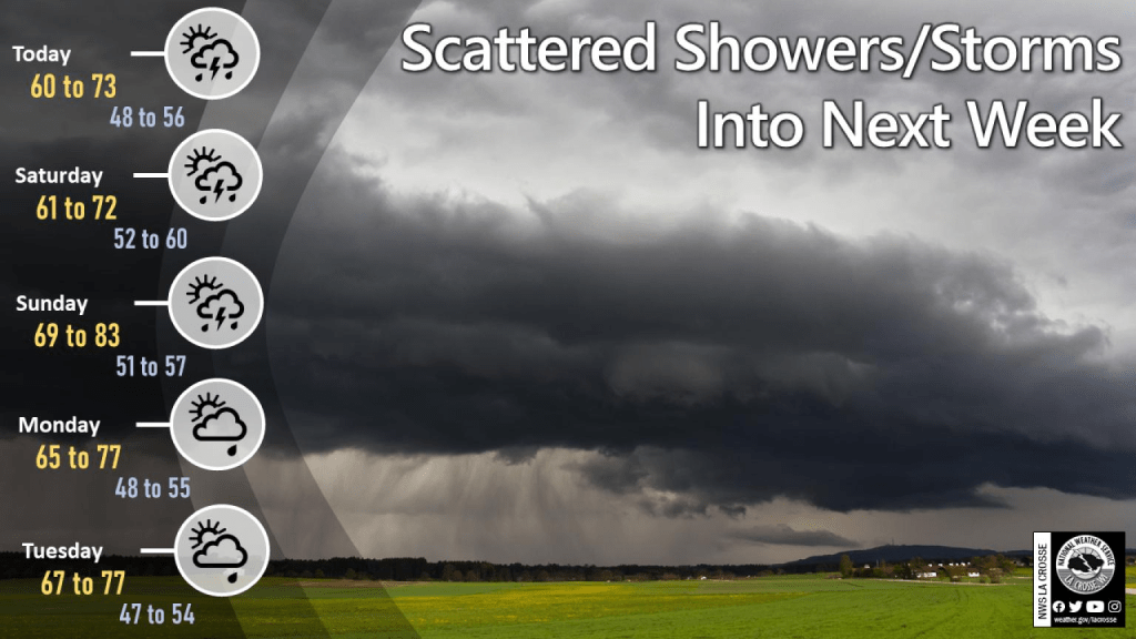 Saturday: A 50% chance of showers and thunderstorms. Mostly cloudy, with a high near 70. Breezy, with a southeast wind 10 to 16 mph, with gusts as high as 26 mph.