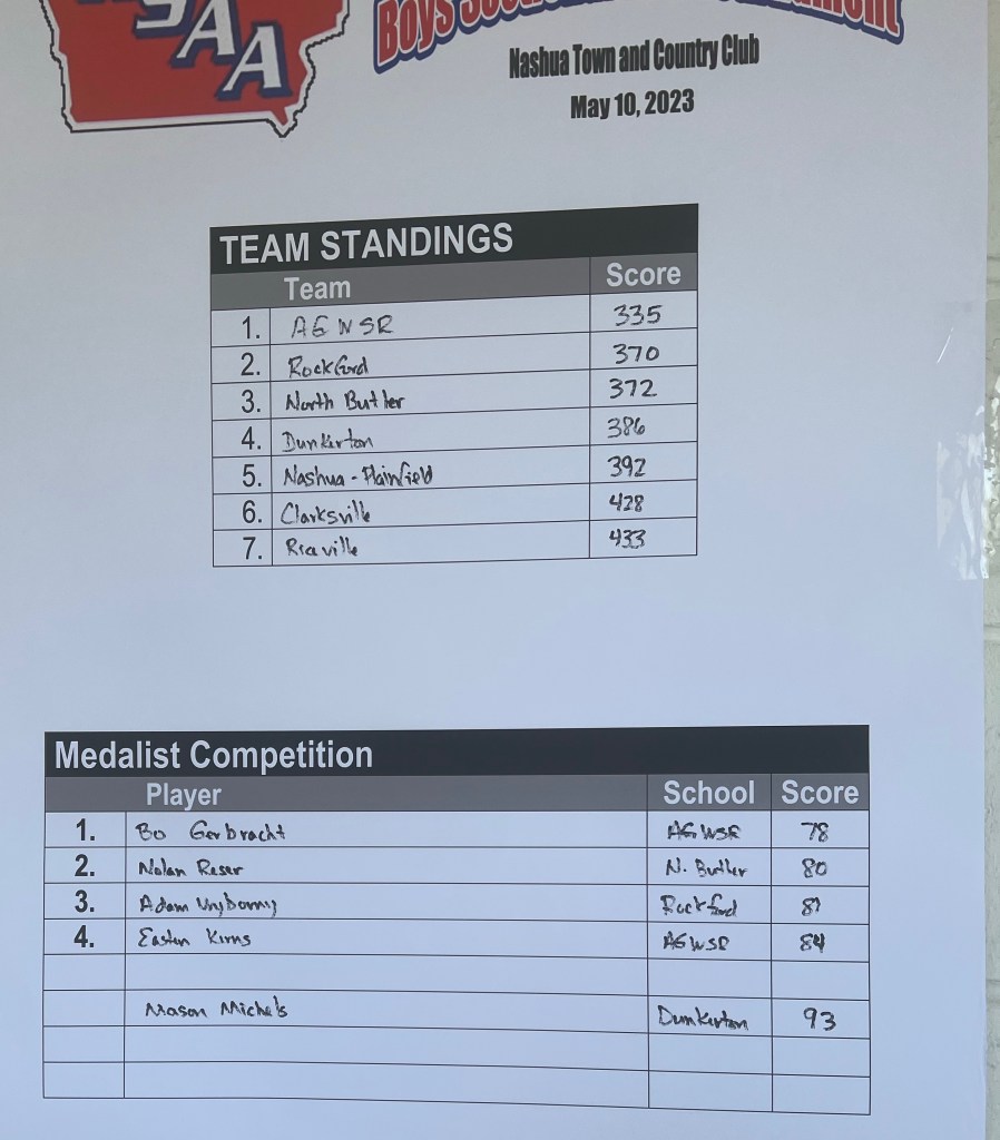 After 18 holes, AGWSR scored 335 as a team, followed by Rockford (370), North Butler (372), Dunkerton (386), Nashua-Plainfield (392), Clarksville (428) and Riceville (433).