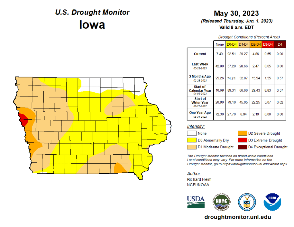 DROUGHT DEVELOPING IN PARTS NE IOWA: During May, precipitation totals ranged from 0.93 inches near Oelwein to 7.71 inches in Osage. For many locations, precipitation totals were 25% to 50% of normal (2 to 4 inches below normal). This resulted in the expansion of abnormally dry (D0) conditions in northeast Iowa, southeast Minnesota, and western Wisconsin. — National Weather Service