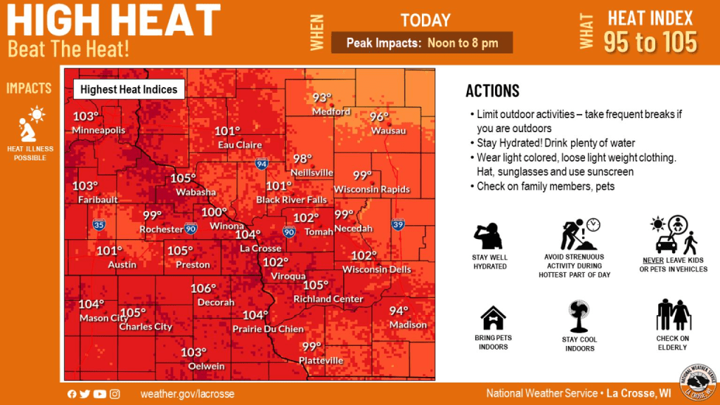 Today — Mostly sunny and hot, with a high near 96. Heat index values as high as 105. Light south wind increasing to 8 to 13 mph in the morning.